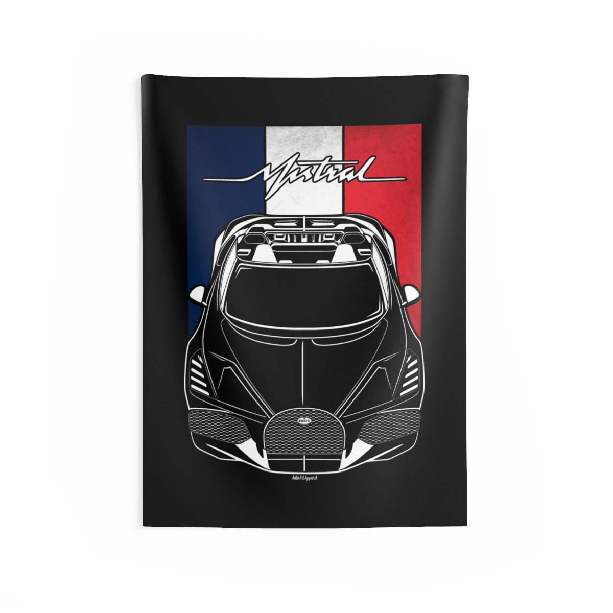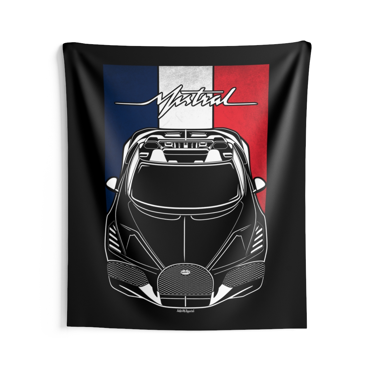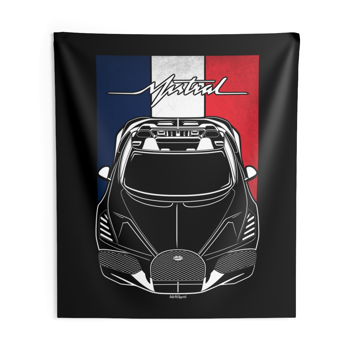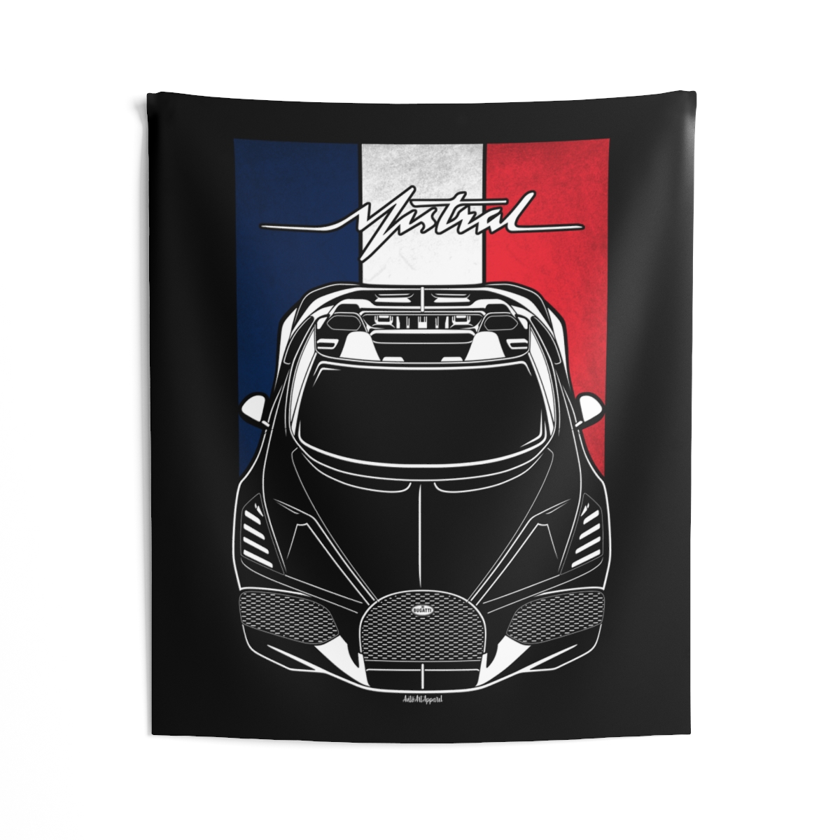 The spirit of the Bugatti Mistral extends beyond the driveway. This tapestry delivers a bold visual statement while maintaining a clean and tasteful look. This edition includes subtle flag elements that strengthen the connection to the car’s origin. A thoughtful Bugatti Mistral tapestry gift for automotive enthusiasts.