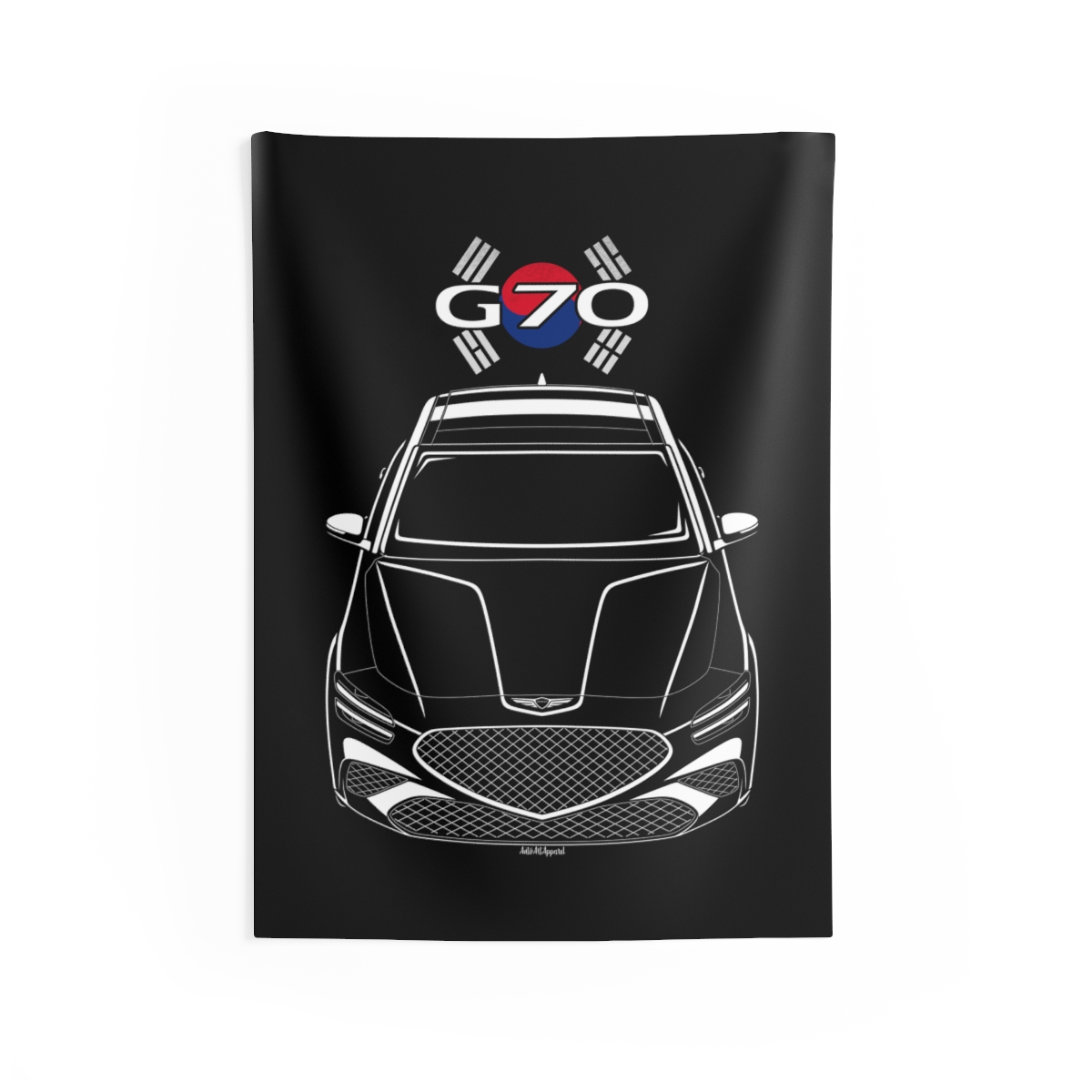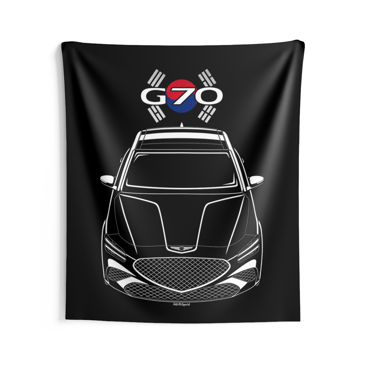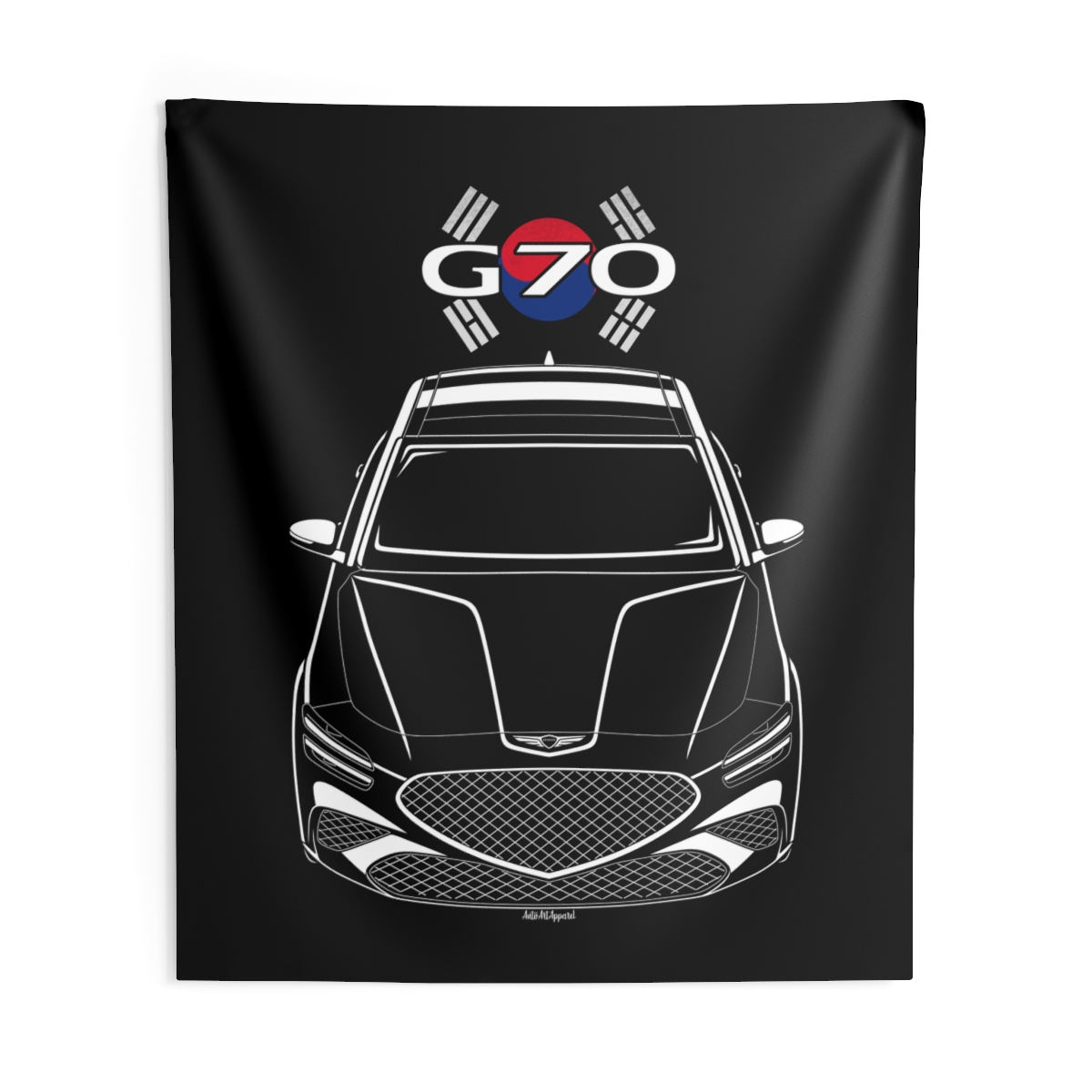 The spirit of the Genesis G70 extends beyond the driveway. This tapestry delivers a bold visual statement while maintaining a clean and tasteful look. This edition includes subtle flag elements that strengthen the connection to the car’s origin. A thoughtful Genesis G70 tapestry gift for automotive enthusiasts.
