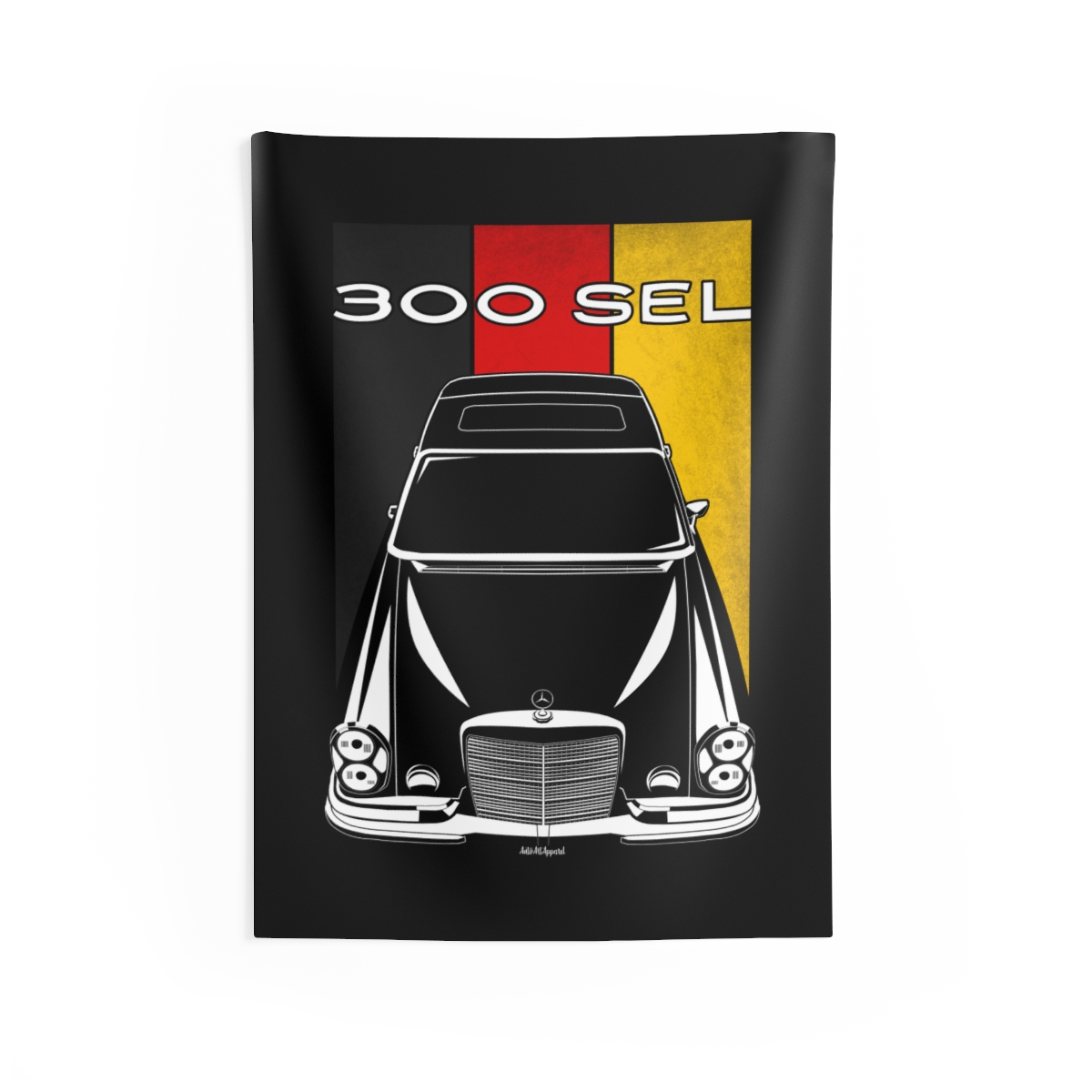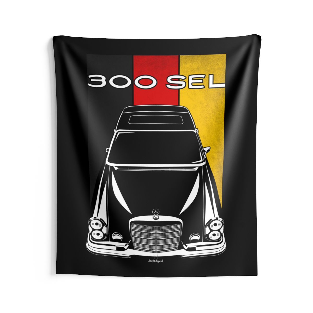 The spirit of the Mercedes 300 SEL extends beyond the driveway. This tapestry delivers a bold visual statement while maintaining a clean and tasteful look. This edition includes subtle flag elements that strengthen the connection to the car’s origin. A thoughtful Mercedes 300 SEL tapestry gift for automotive enthusiasts.